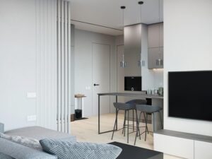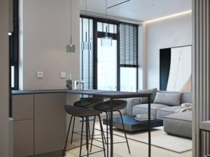 This one-bedroom apartment in New York City showcases a modern minimalist design that balances simplicity with sophistication. A soft neutral color palette creates an airy and calming atmosphere, while bold black accents add contrast, depth, and contemporary edge. Thoughtful space planning enhances light and functionality, making this apartment both stylish and practical for urban living.